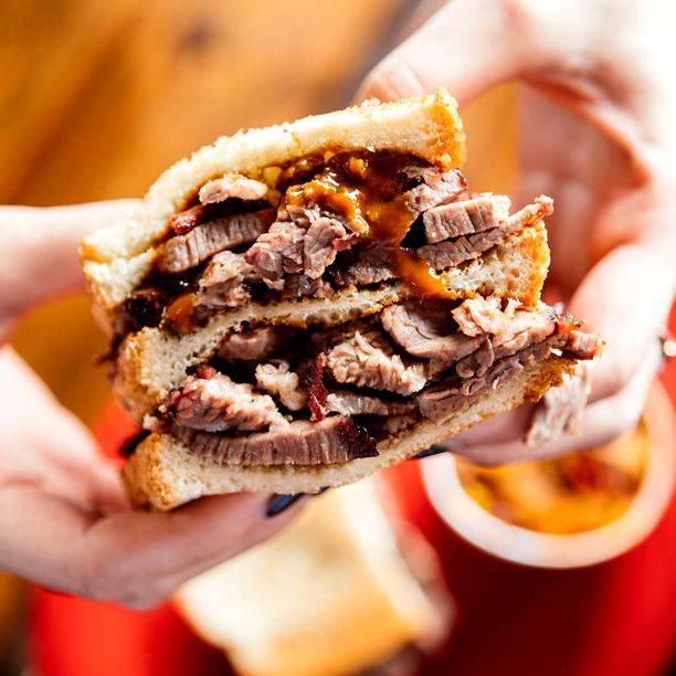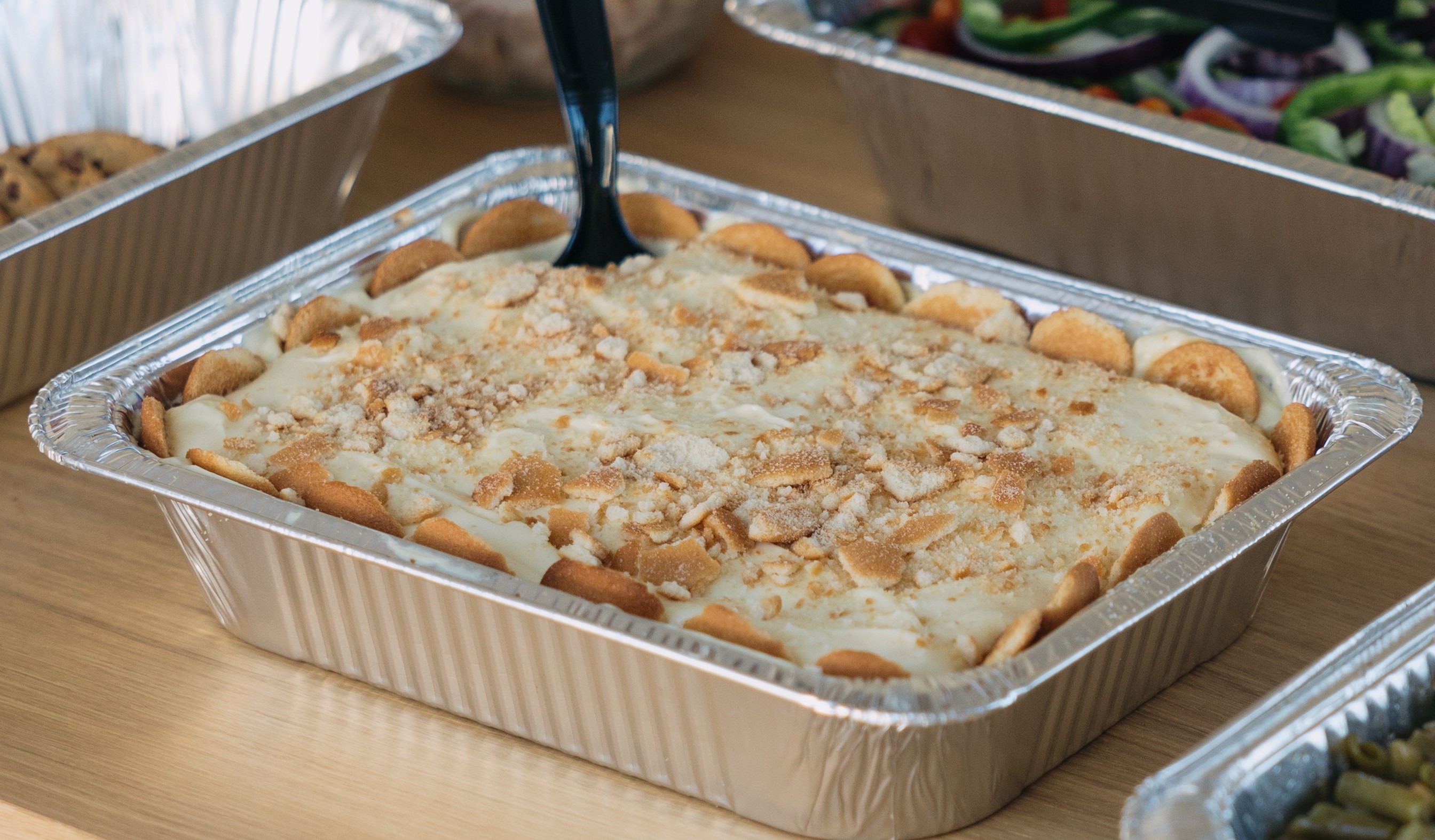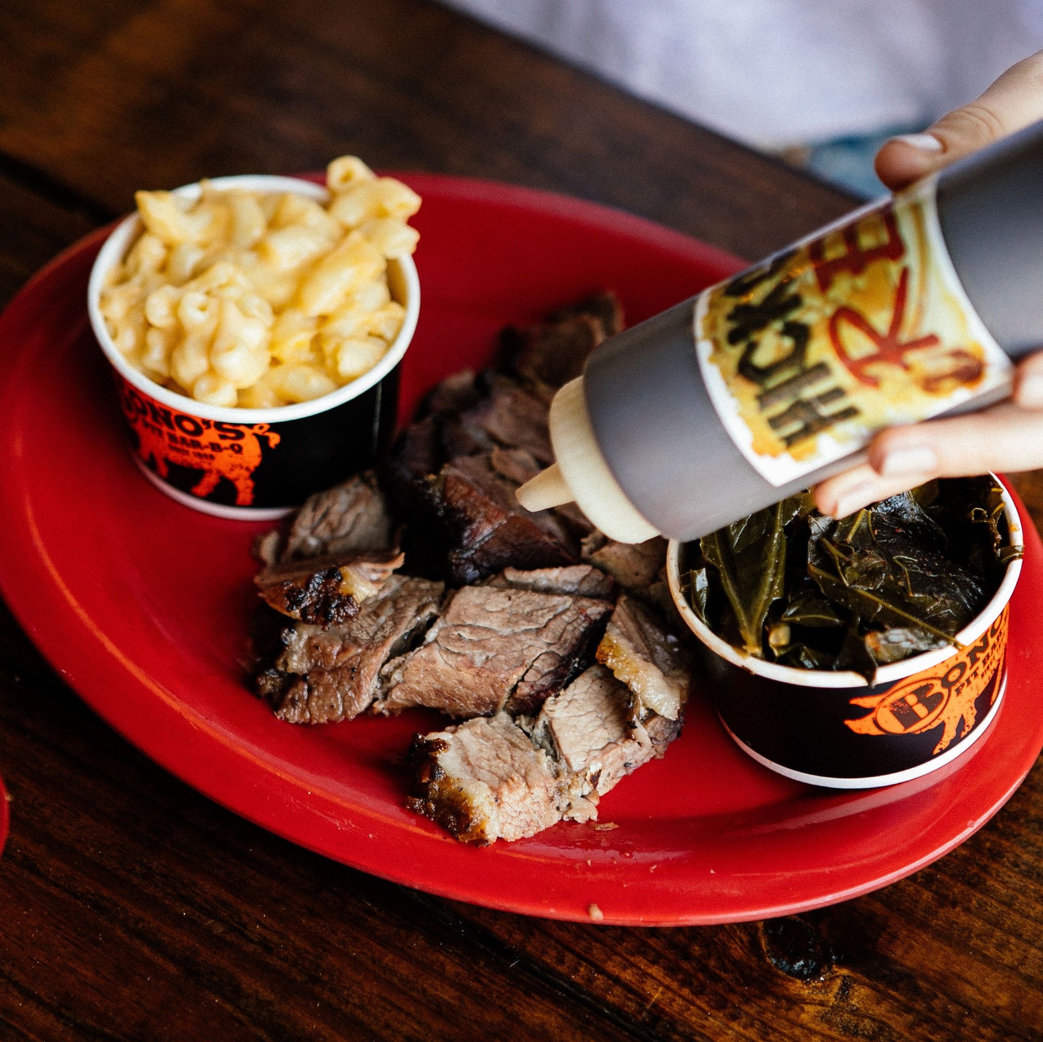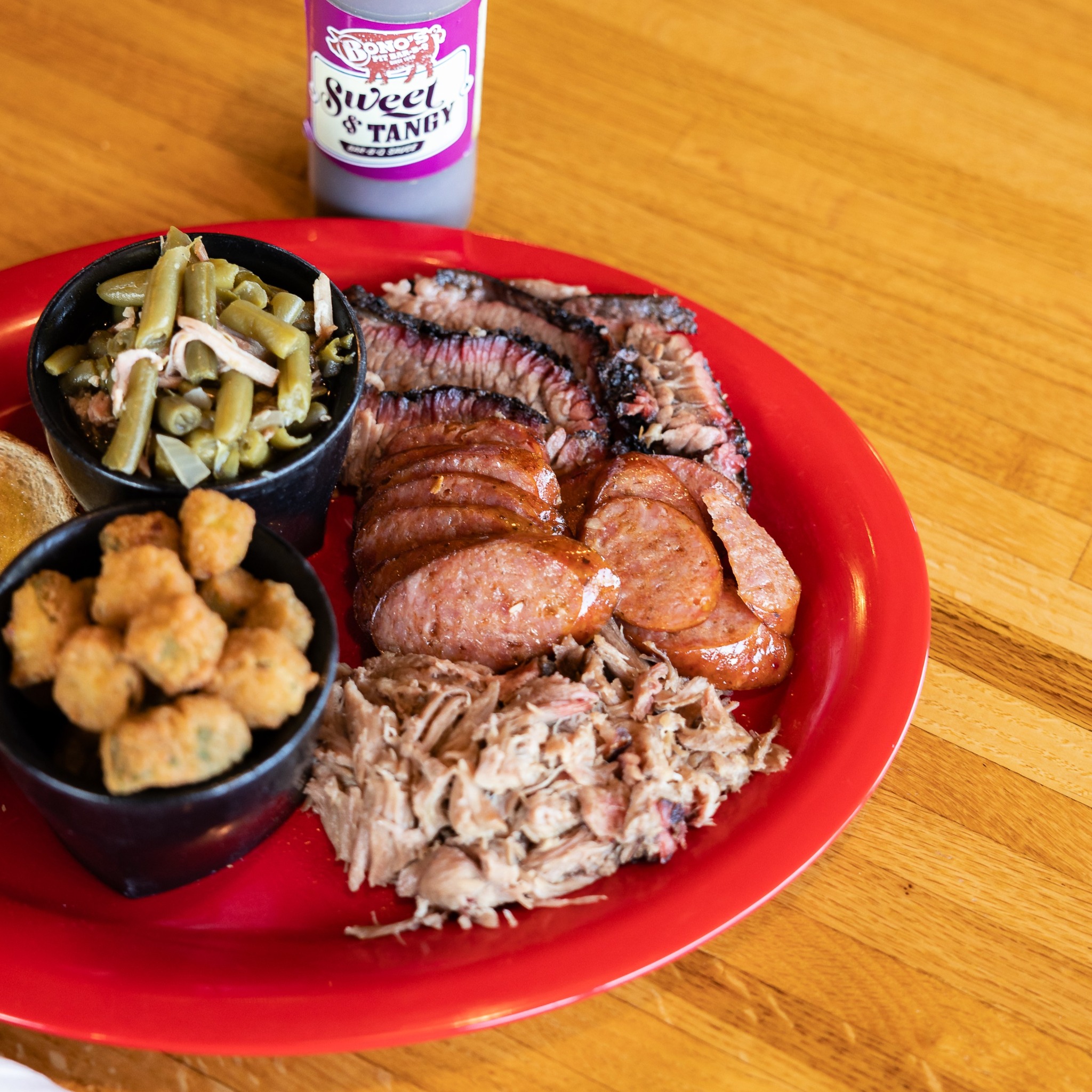 Brisket plus two Meats with your choice of 3 Traditional Sides, Bread, Beverages, Paper Products, Disposable Serving Utensils and BBQ Sauce