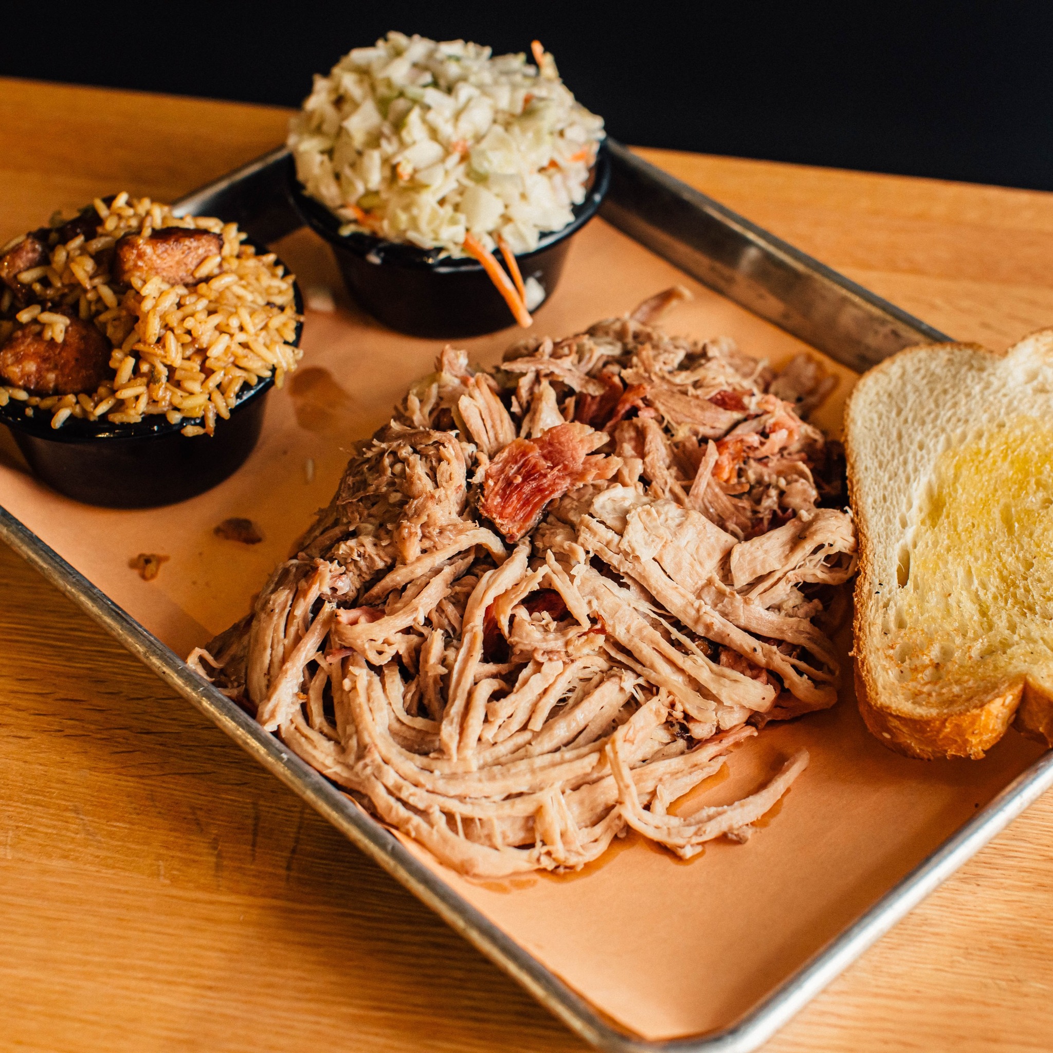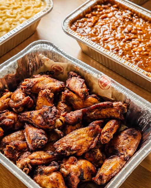 Two lb. Pulled Pork, 30 Smoked Wings, with your choice of 3 Traditional Sides, 10 Peices of Garlic Toast, 1-Gallon Beverage, Paper Products, Disposable Serving Utensils and BBQ Sauce