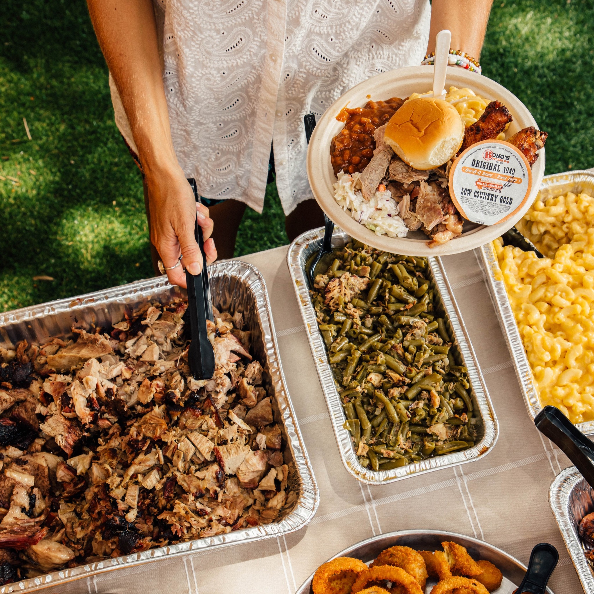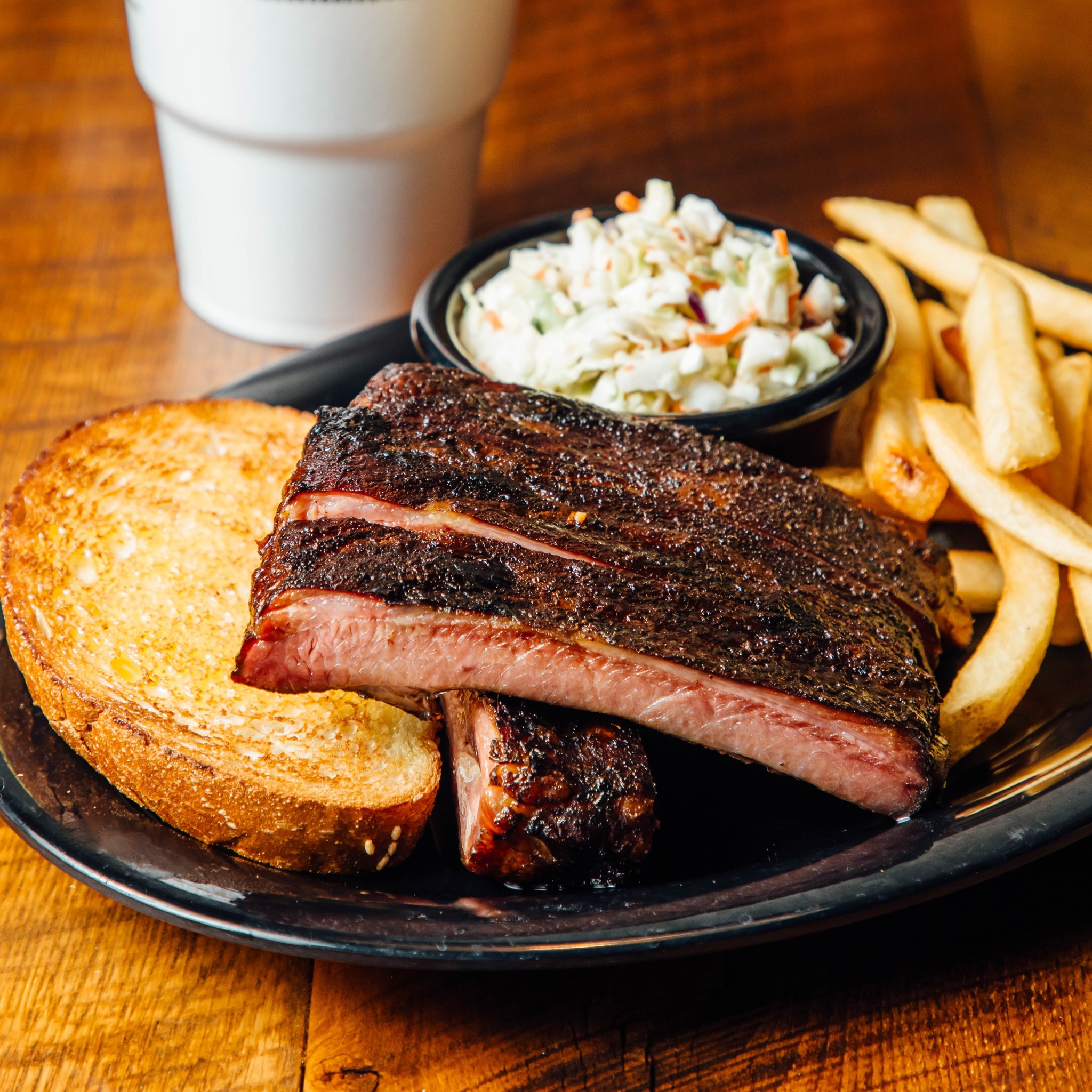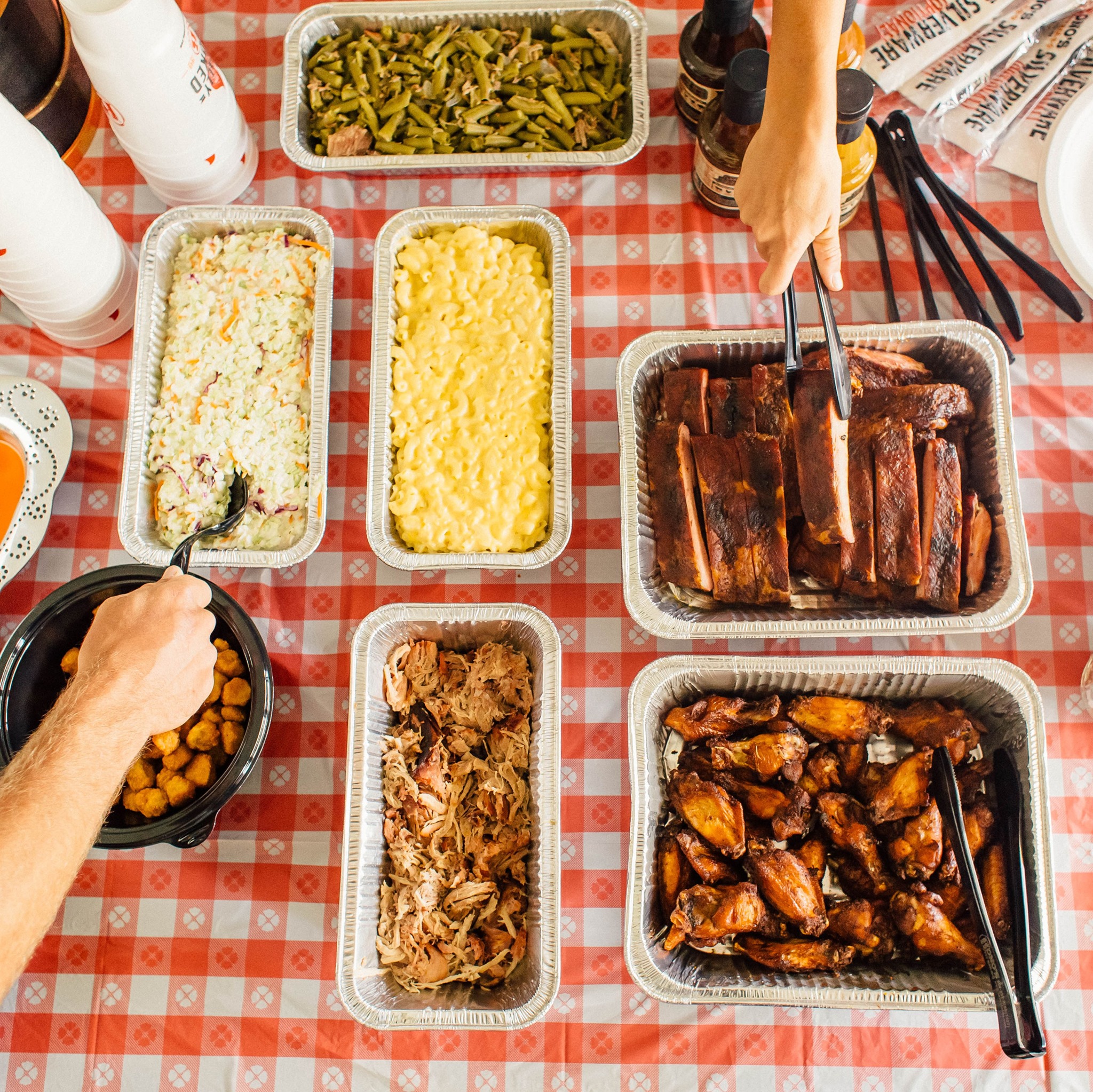 Ribs plus two Meats with your choice of 3 Traditional Sides, Bread, Beverages, Paper Products, Disposable Serving Utensils and BBQ Sauce