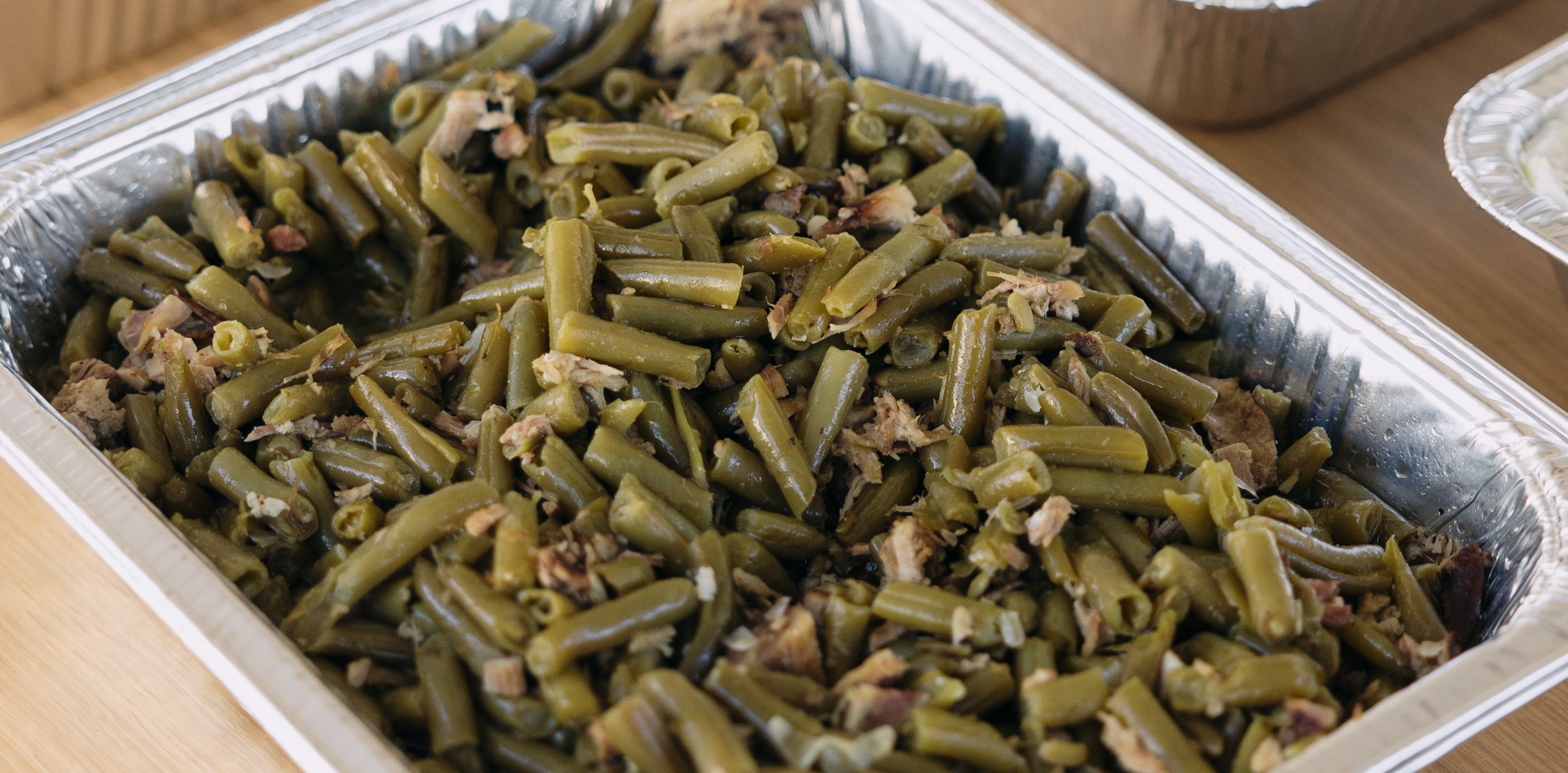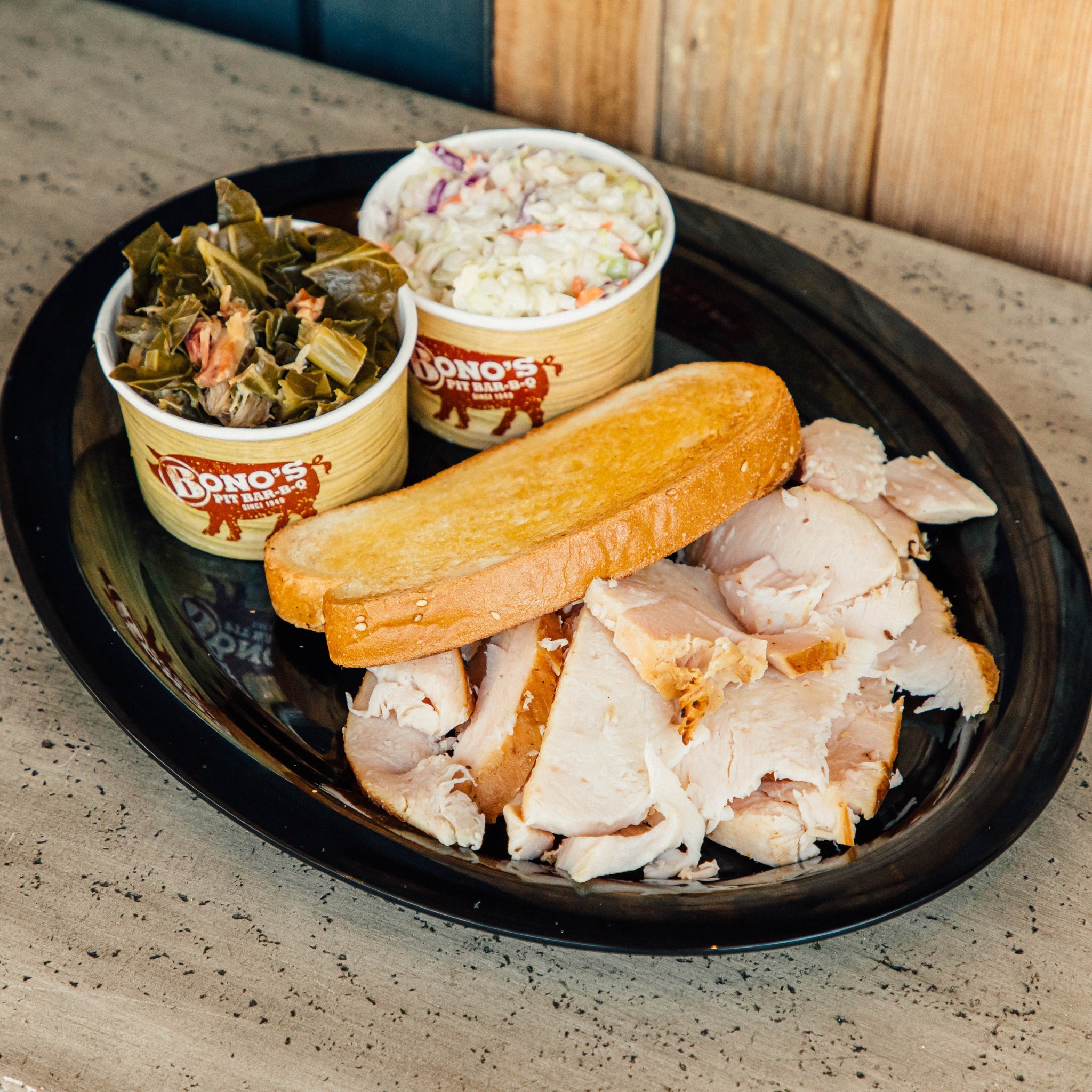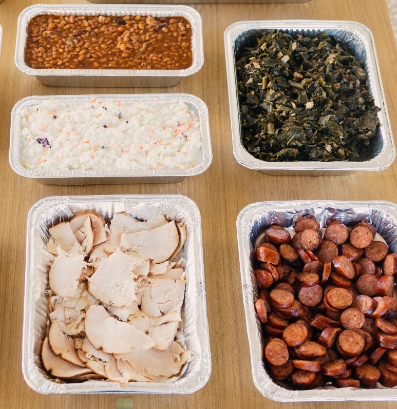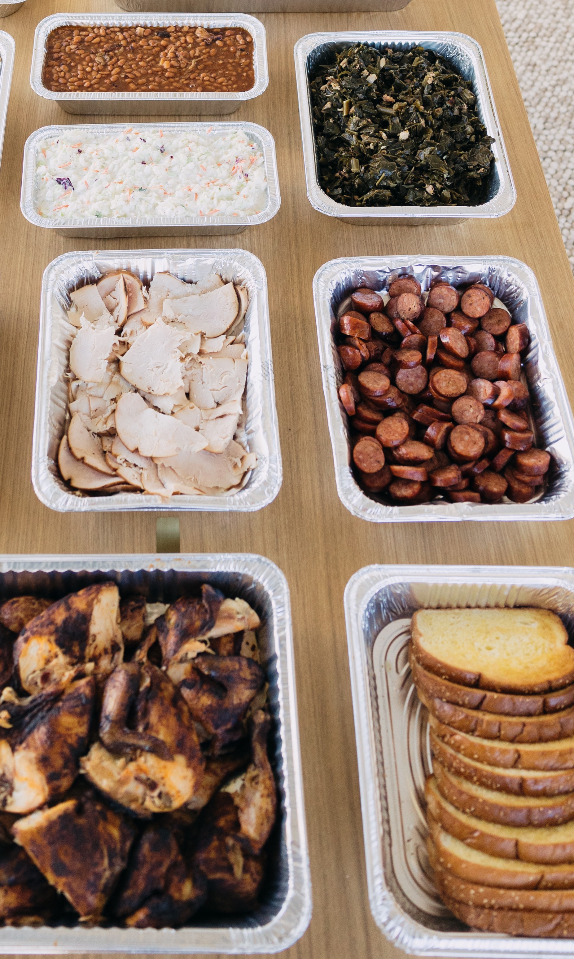 Two Meat combo with your choice of 3 Traditional Sides, Bread, Beverages, Paper Products, Disposable Serving Utensils and BBQ Sauce