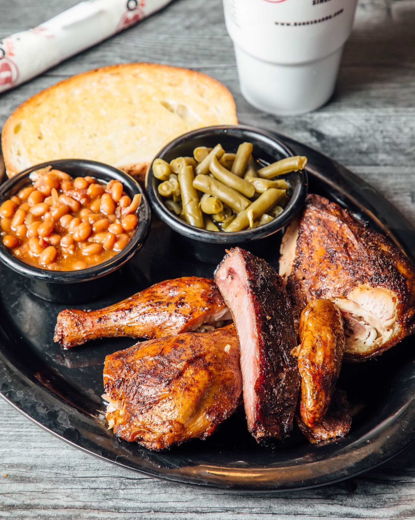Three Meat combo with your choice of 3 Traditional Sides, Bread, Beverages, Paper Products, Disposable Serving Utensils and BBQ Sauce