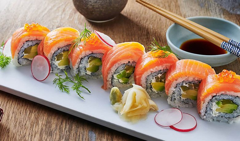 Fresh salmon and creamy avocado rolled with rice and nori.