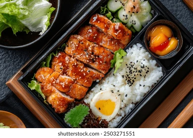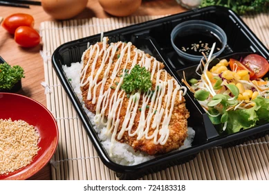 Crispy breaded pork cutlet served with rice, vegetable salad.