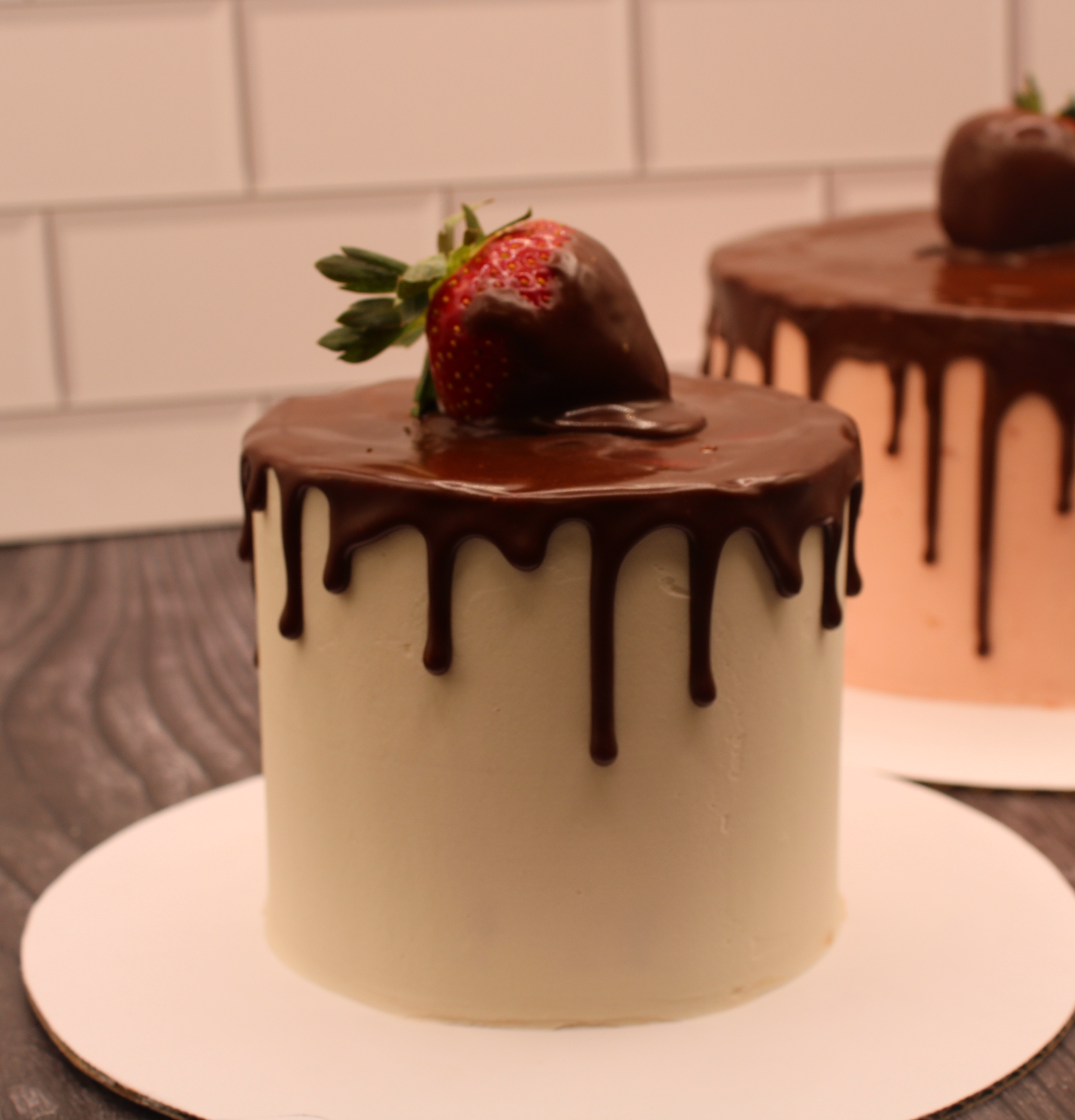 A small, decadent cake finished with a rich chocolate drip and topped with a luscious chocolate-covered strawberry. Available Gluten Free.