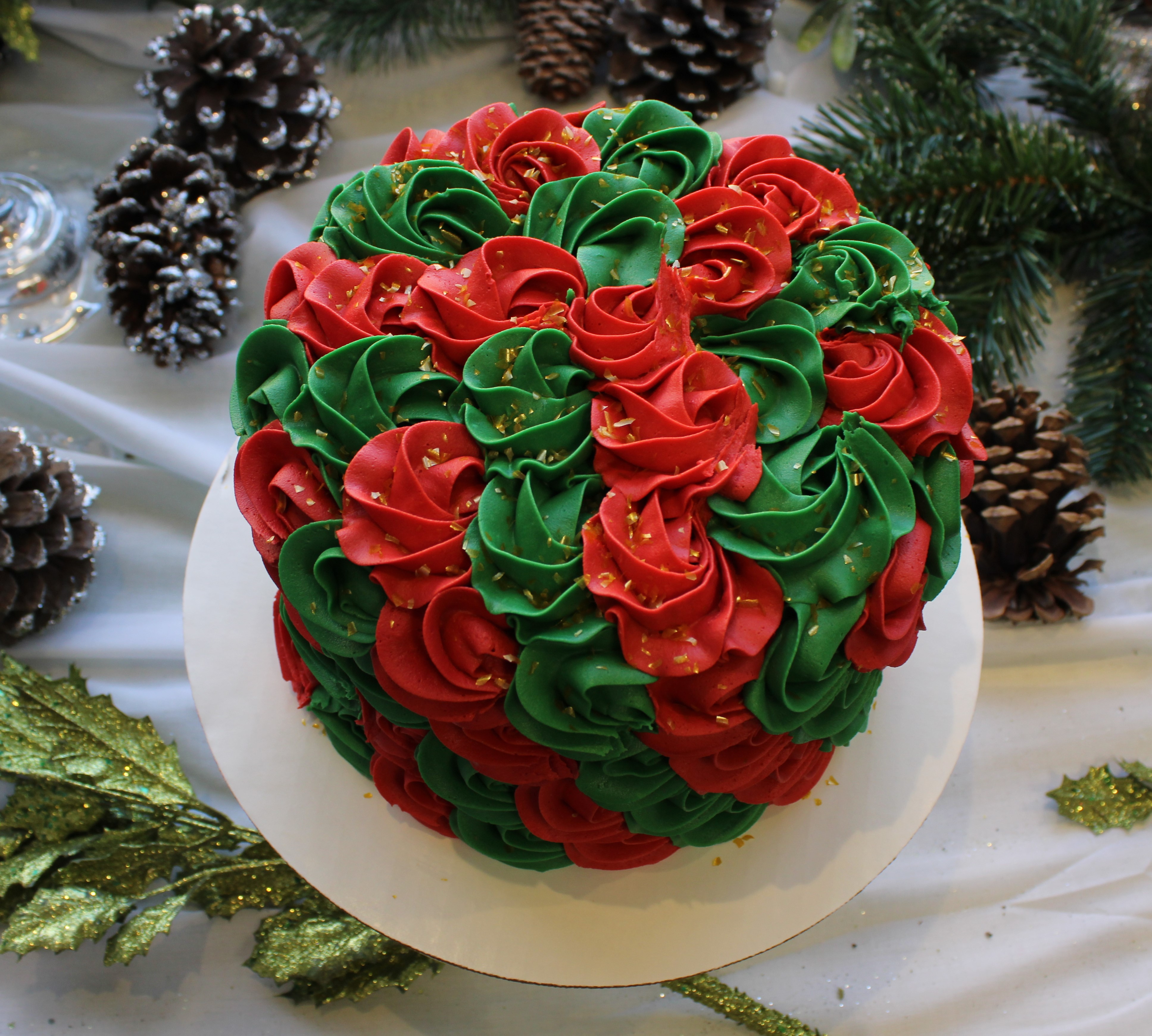 Vegan and Gluten Free Chocolate Cake, Red & White Swirled Mint Buttercream, with White Shimmers. Only available December 15th-28th